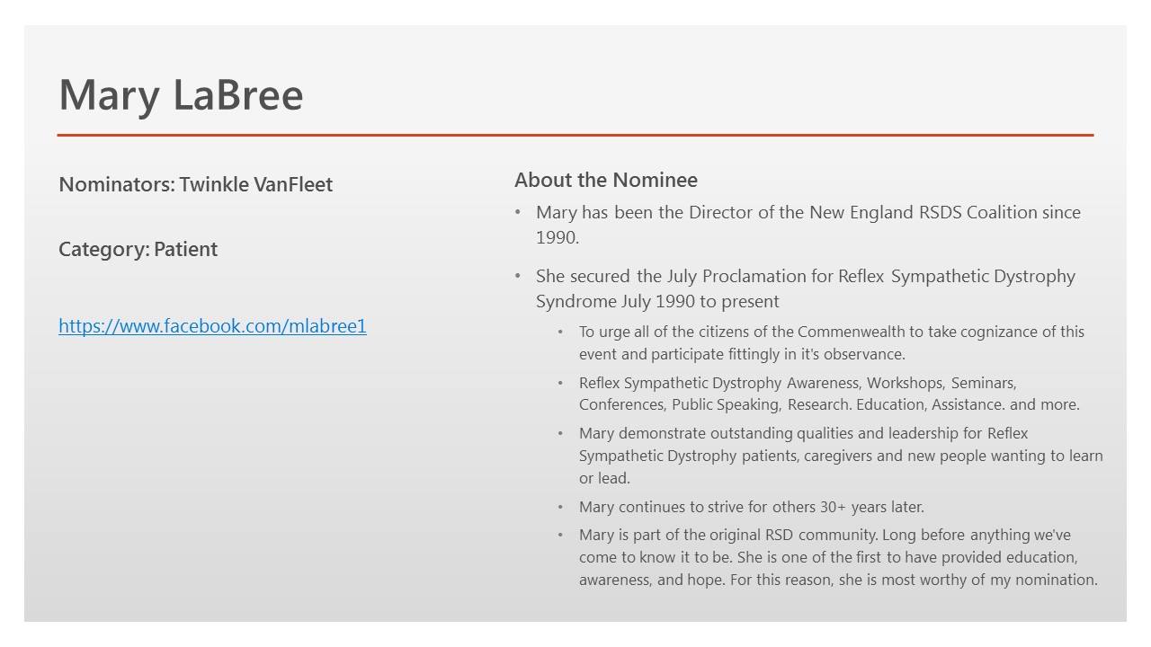 One of our original RSDS Advocates, Mary LaBree, passed away on October 15, 2015 due to complications from Reflex Sympathetic Dystrophy (RSD). Mary exemplified commitment to the RSD community for over 3 decades. As the Director of the New England RSDS Coalition since 1990, Mary sought to educate and bring awareness to the public and private sectors for the disease that was virtually unheard of back then. Originally from Leicester, Massachusetts, she was formally educated at Worcester State University in Worcester, Massachusetts.